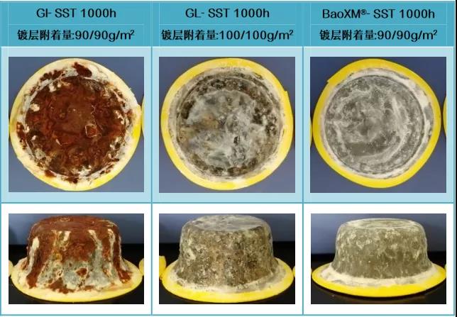 中性鹽霧試驗條件下,BaoXM®拉延加工部位耐蝕性優異,T彎耐蝕性較熱鍍鋅提升7倍以上,沖杯耐蝕性提升10倍以上,優于鍍鋁鋅。