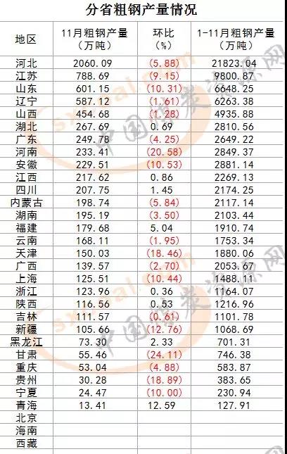 第一無懸念,2018年1-11月各省粗鋼產量排行榜